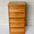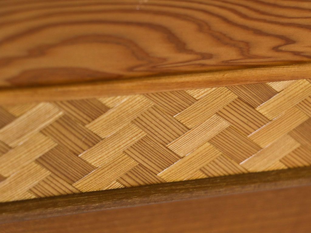 屋久杉ならではの美しい木目の無垢材をふんだんに使ったチェストです。大小の引出しで整理しやすく、大引出しは軽い力で出し入れできるスライドレール式も選べます。スリムサイズなので、すき間使いにも便利です。アクセントとして一番下の引き出しには家具の表面を網代編みの技法を駆使し仕上げました。網代編みができる職人もすっかり減ってしまいました。丁寧に編み込んだデザインがお洒落な和モダンな空間を演出してくれます。