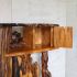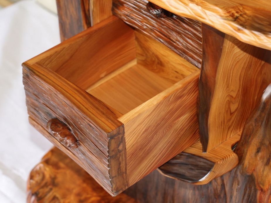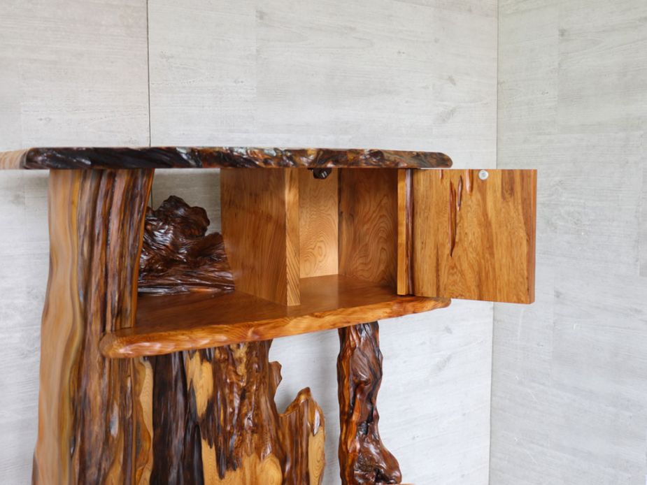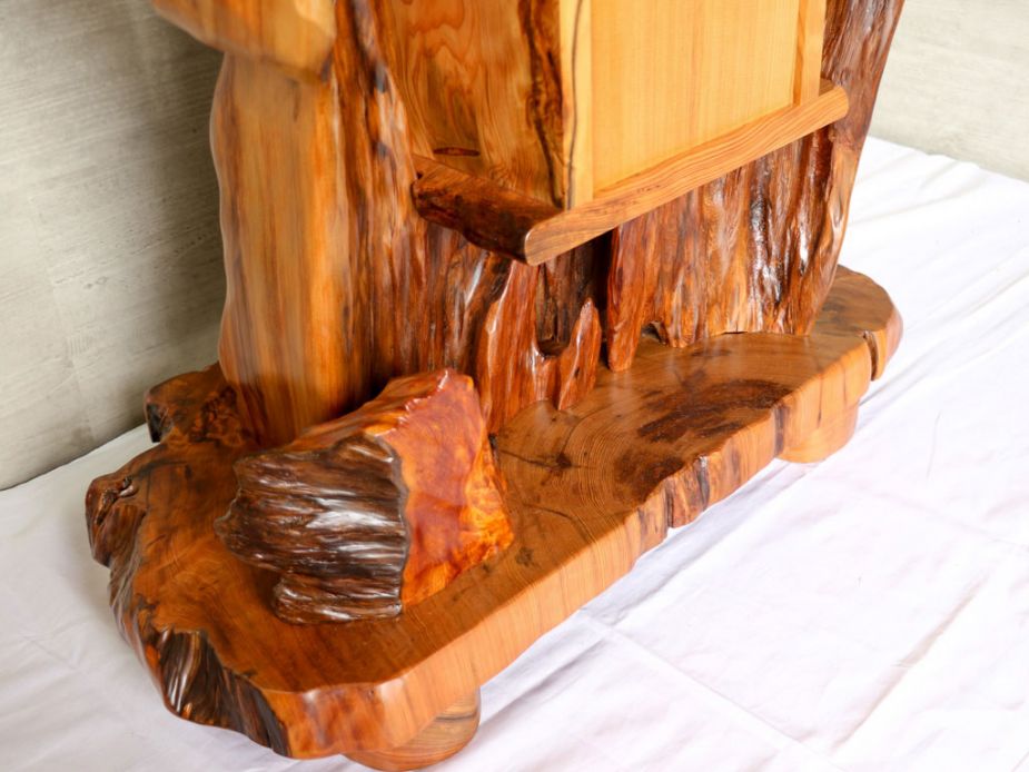 1本の屋久杉の古木の朽ち果てた部分と生きていた部分をそのまま使い、樹皮の部分や板にした部分を組み合わせて飾り棚にしました。屋久島の森の中で出会う樹木のような佇まいです。屋久杉の中で現在残っているものは幹の凹凸がの激しく、江戸時代に利用できない巨木として切り残された木です。樹齢が千年を超える屋久杉の場合、年月がたつと根元の中心部分は時間がたちすぎて分解が進み、大きな洞となる場合があります。幹の凹凸した肌の部分や瘤を贅沢にあしらいました。屋久杉が語りかけてくるような神秘性のある一品物です。