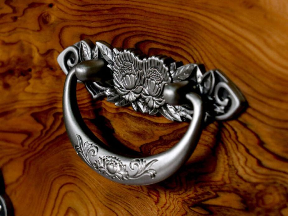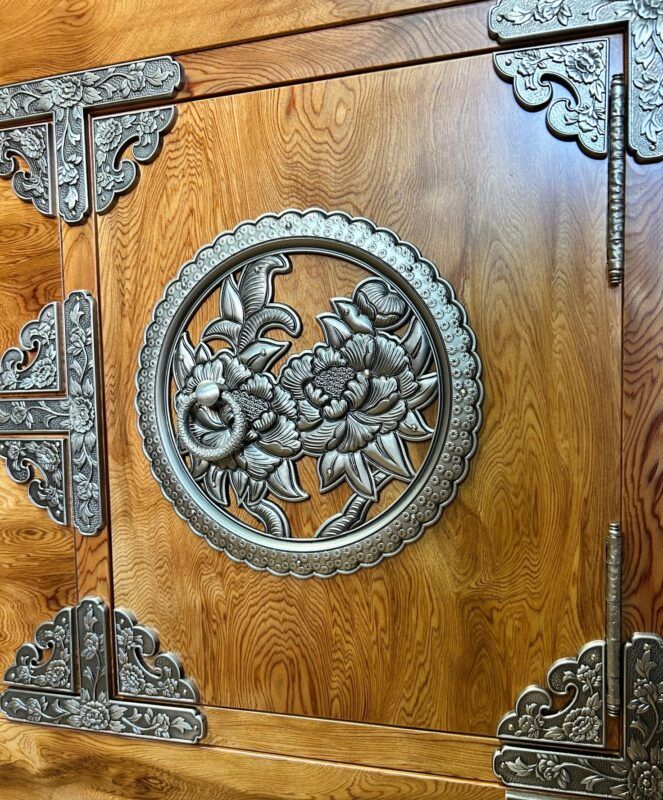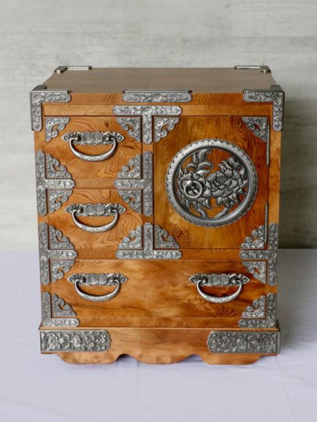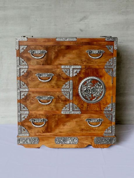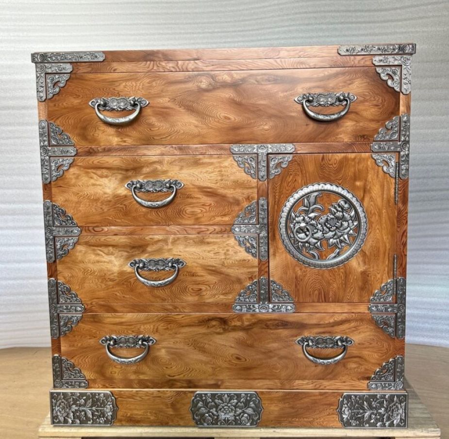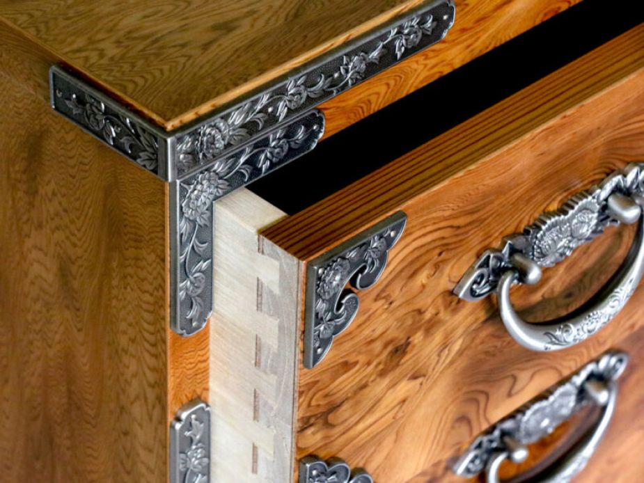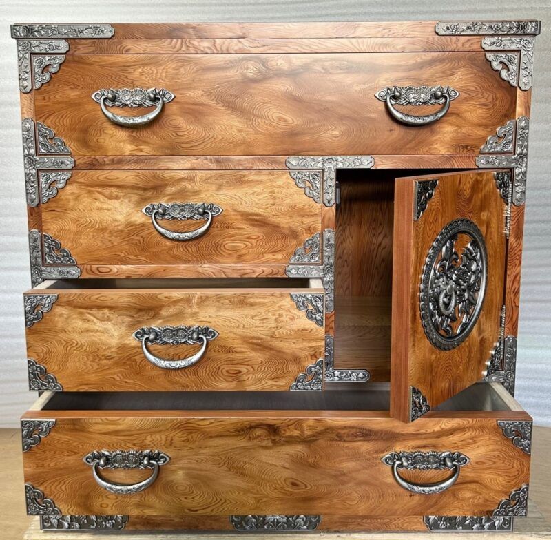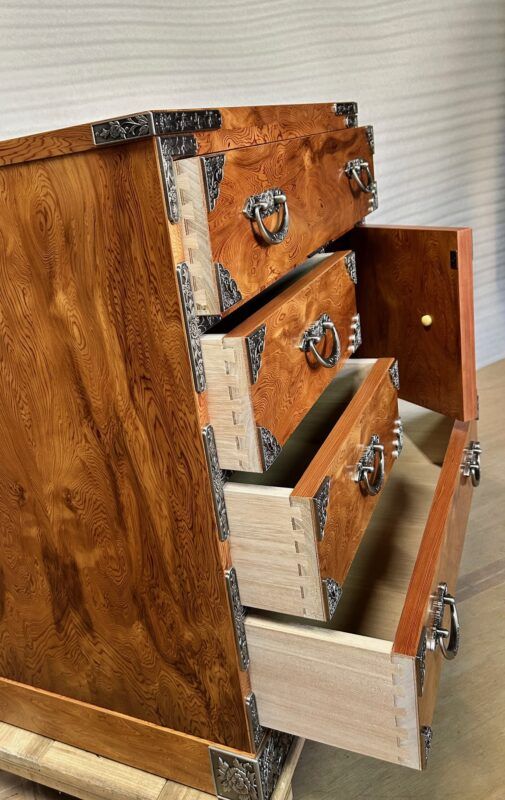 桐箪笥の表を屋久杉の板で包みました。 屋久杉の中でもなかなか手に入れることが難しい、龍が飛ぶような独特な光の陰影が特徴的な貴重な部材を使いました。 手打ち金具の風合いを感じさせる真鍮の飾り金具をあしらって丁寧に仕上げました。