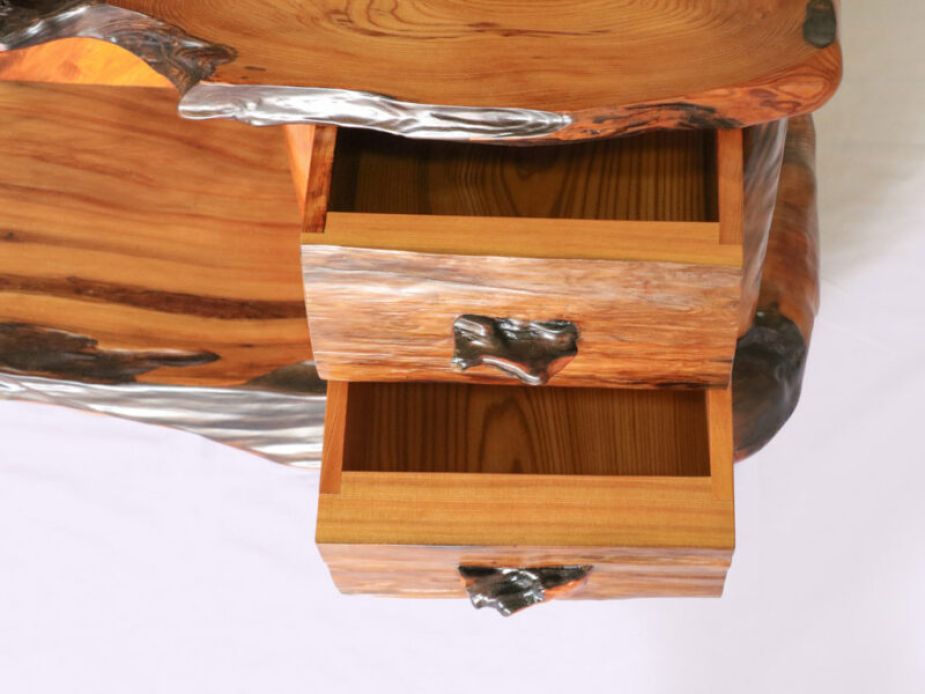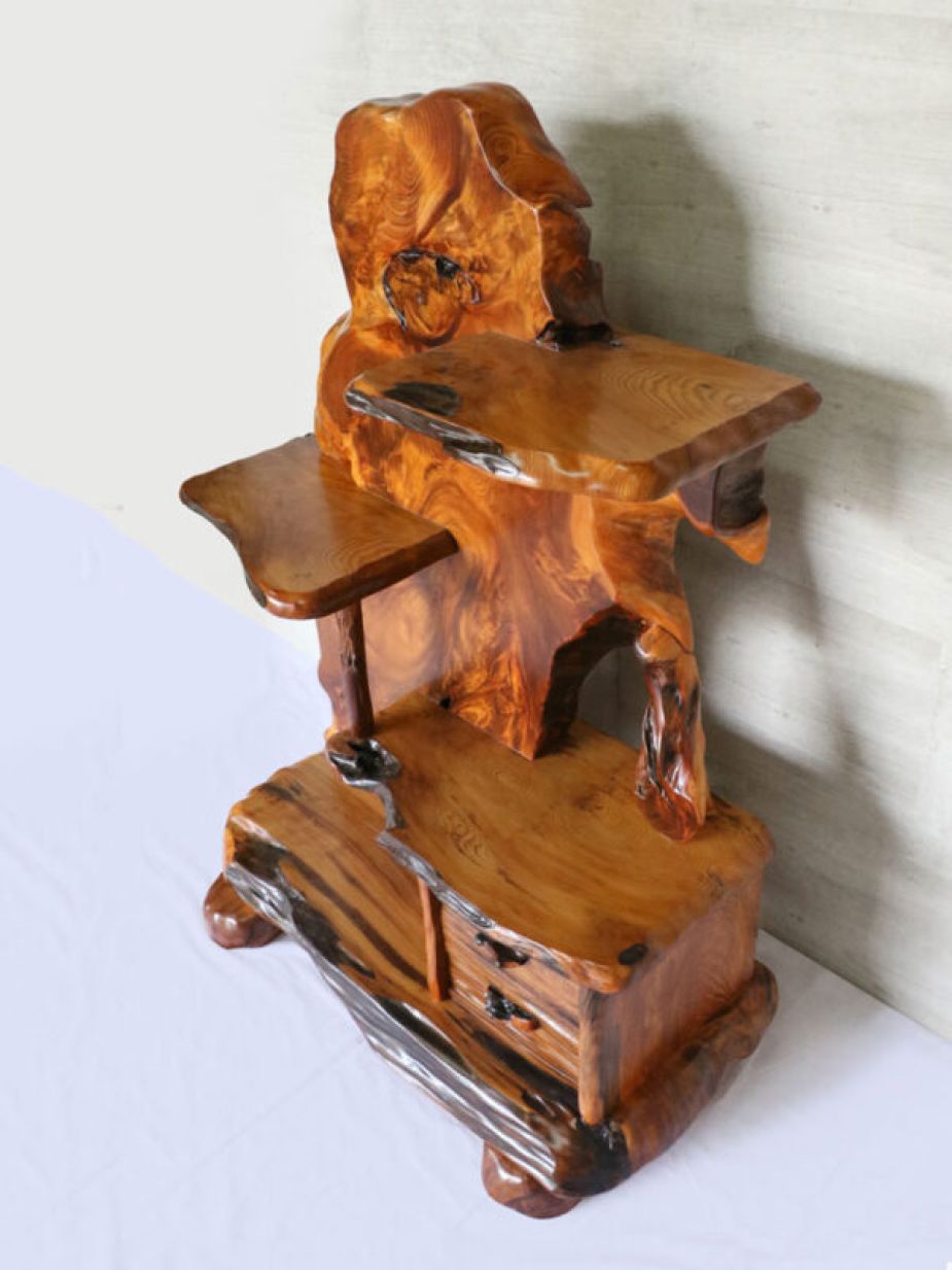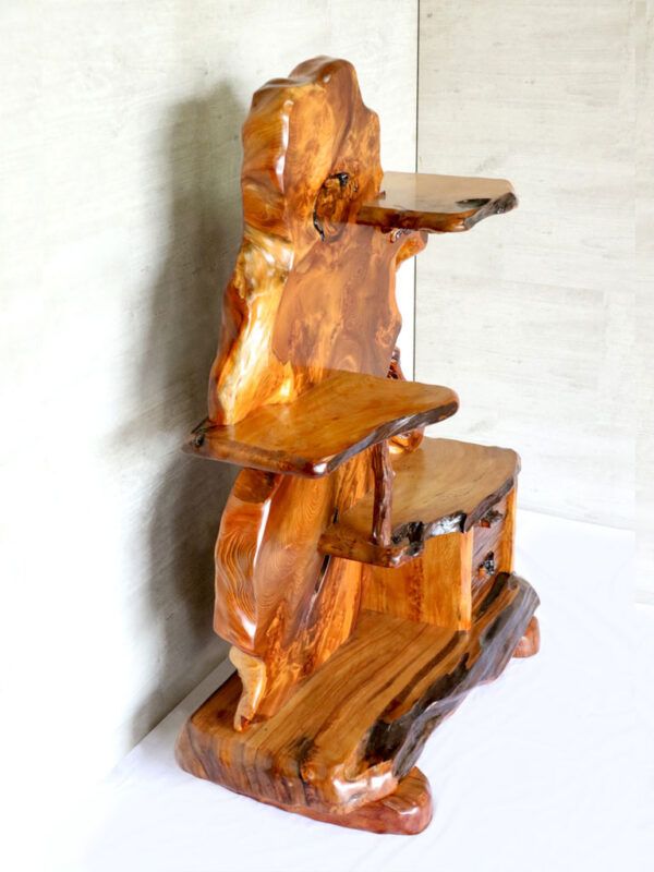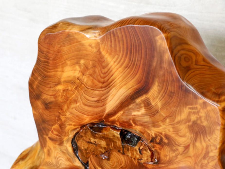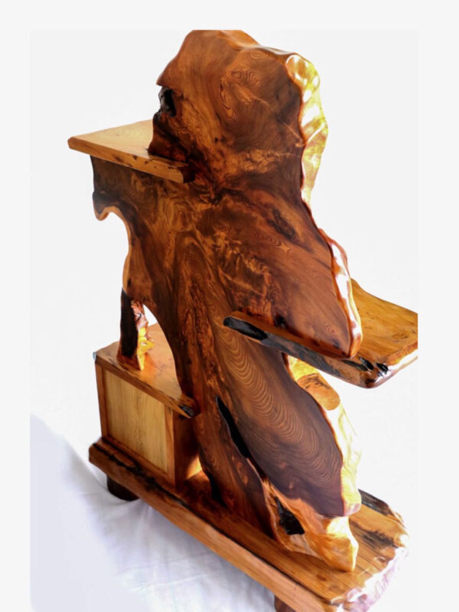 全てを屋久杉の一枚板で仕上げています。 背板は巨木を輪切りにした物を使っています。 独特の杢目の模様と深みのある光沢はまさに一品ものです。