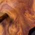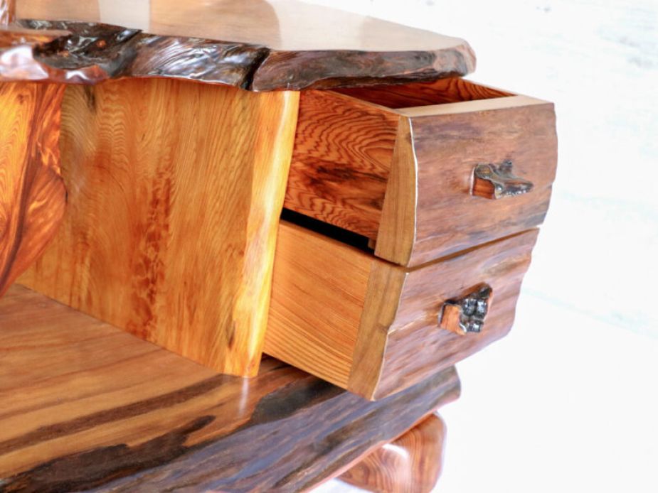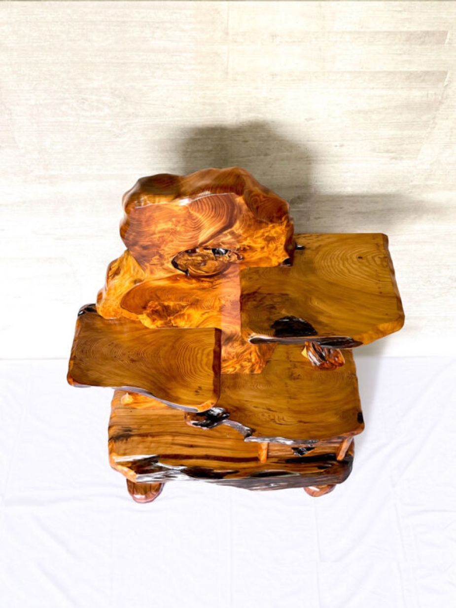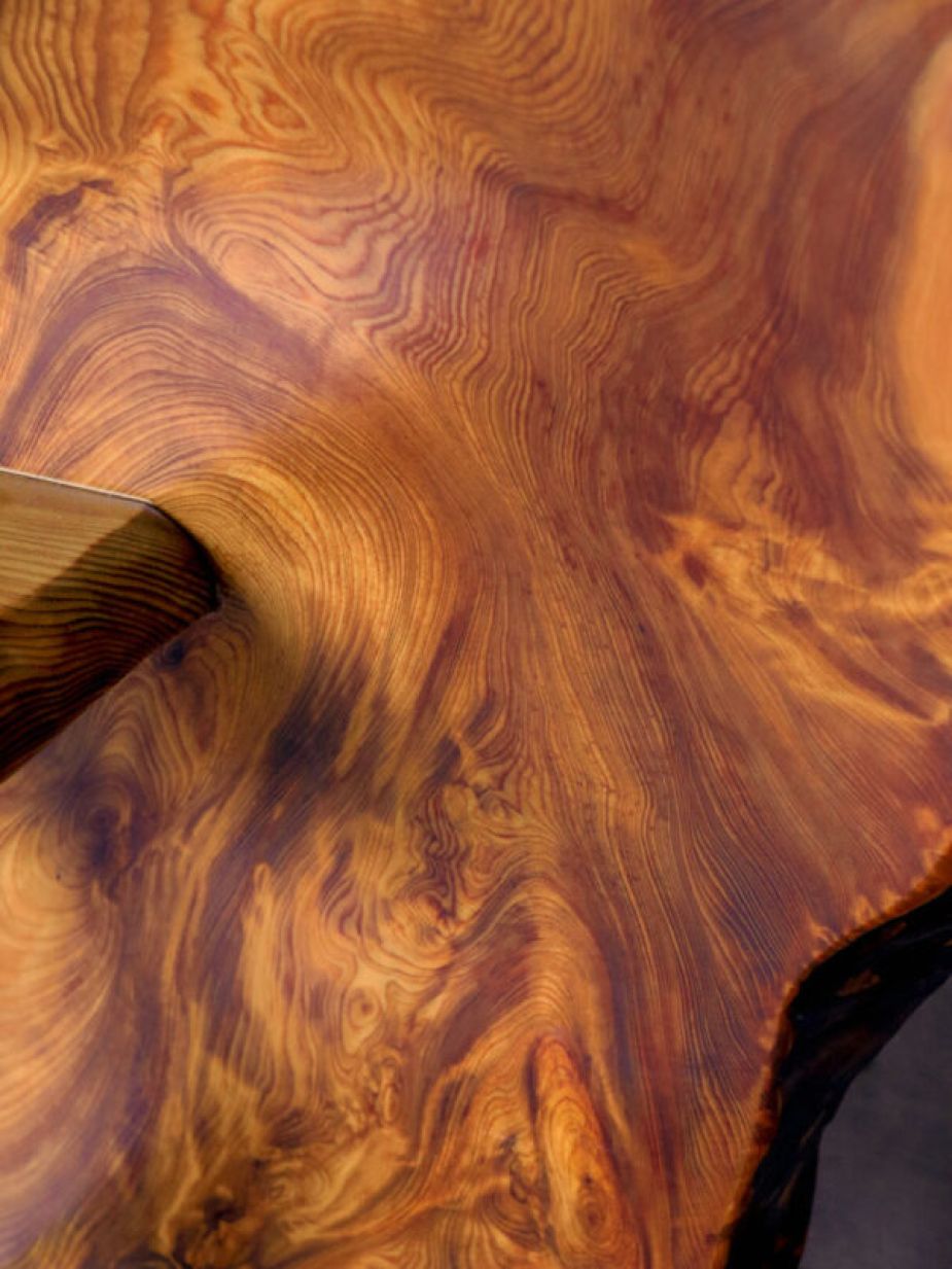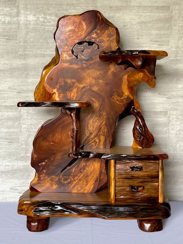全てを屋久杉の一枚板で仕上げています。 背板は巨木を輪切りにした物を使っています。 独特の杢目の模様と深みのある光沢はまさに一品ものです。