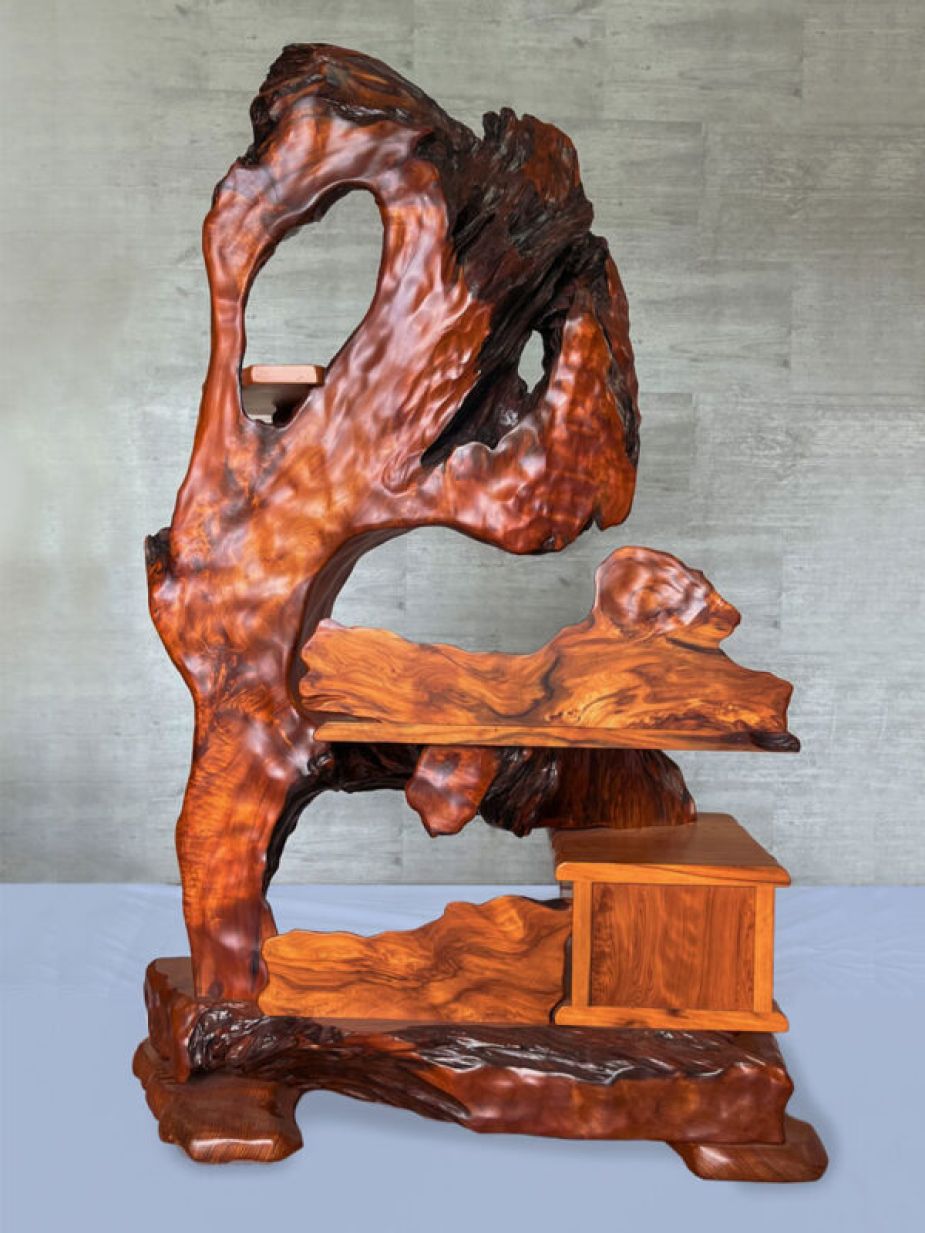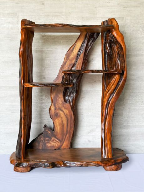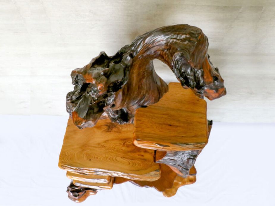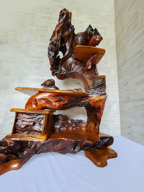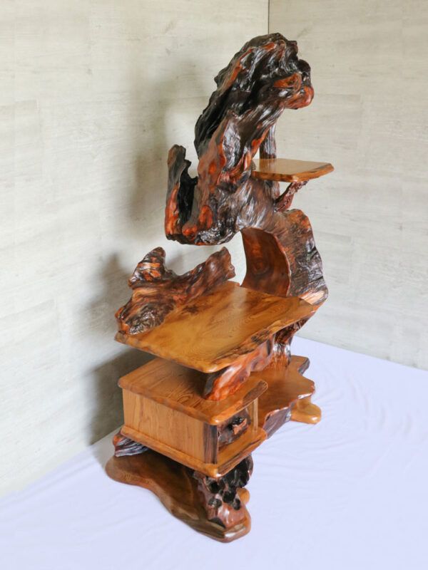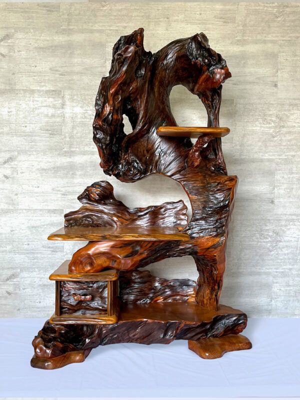 屋久杉の根株を大胆に使った飾り棚です。 これほど大きな切り株を見ているとどれほど雄大な屋久杉だったか、想像を絶する思いです。 一体どのような形をした木だったのか千年の時を感じることができる一品です。