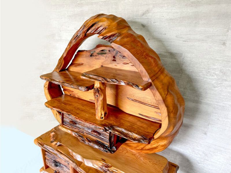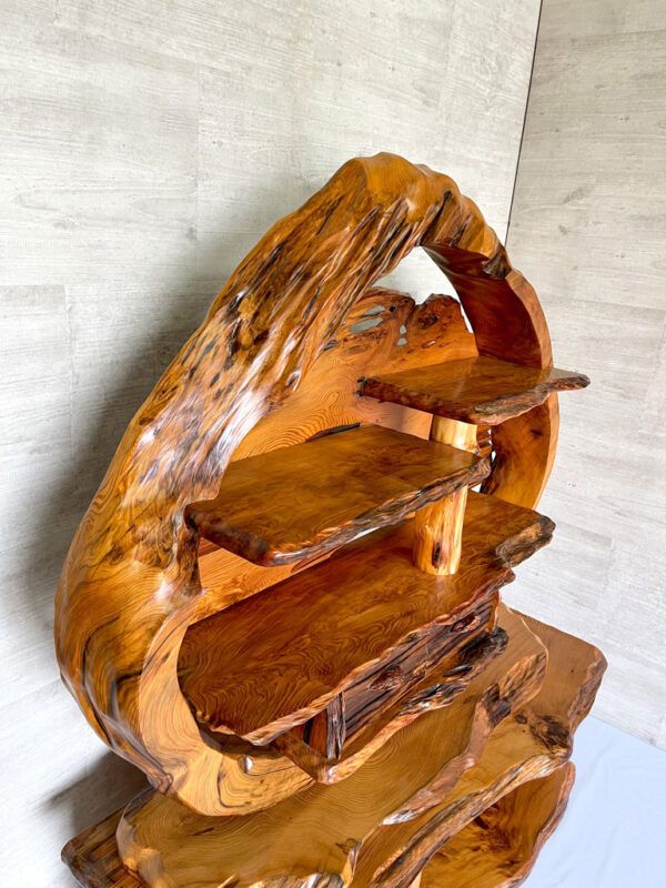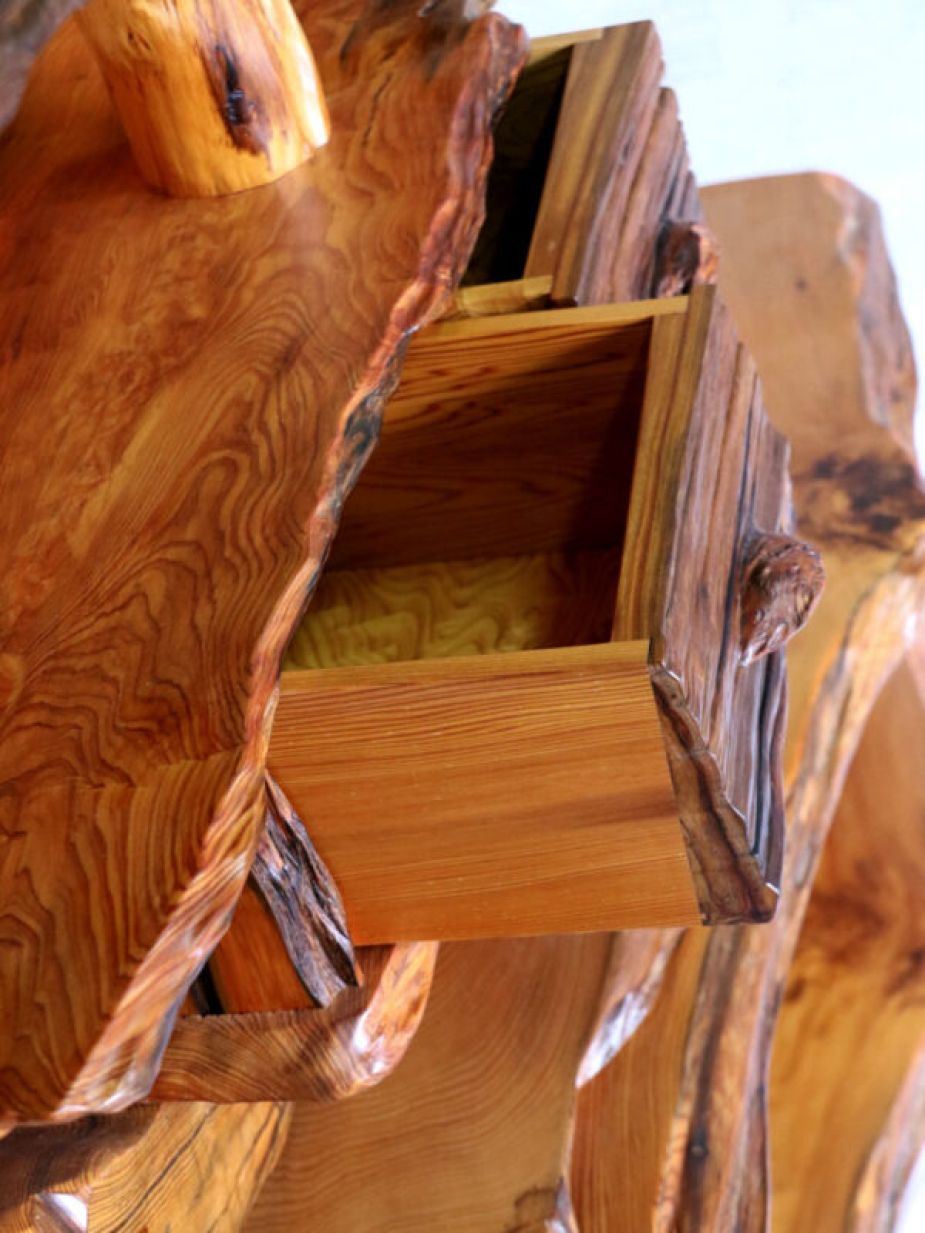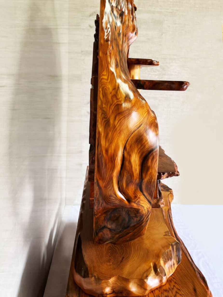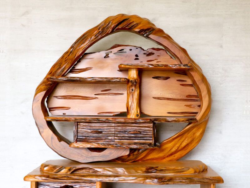 中が空洞になった屋久杉の巨木を輪切りにして大胆にあしらった飾り棚です。